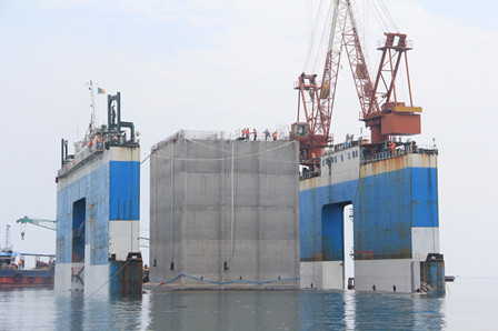 該工程包括1個4萬噸級多用途泊位及1個5萬噸級集裝箱泊位(結(jié)構(gòu)按7萬噸級設計),為沉箱重力式碼頭,由33件2420噸沉箱組成,為喀麥隆基建史上最大的沉箱。為了確保首件沉箱順利出運安裝,項目部多次組織相關部門及技術(shù)人員召開技術(shù)、安全交底專題會,討論并制定出完善的施工方案,先后克服了船機設備維修、作業(yè)工人經(jīng)驗不足等客觀因素的影響,積極組織協(xié)調(diào)人員、機械設備投入施工生產(chǎn),把握潮水變化規(guī)律,科學施工,優(yōu)質(zhì)、安全地完成首件沉箱的安裝,為順利完成沉箱出運任務積累寶貴經(jīng)驗。