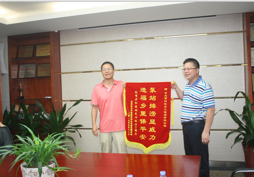 5月26日,深圳市寶安區(qū)沙井街道共和村黨支部書記黎仕生一行三人專程到深圳市水務(wù)工程建設(shè)管理中心,代表村民向共和泵站工程建設(shè)及代運(yùn)管單位——中交四航局贈(zèng)送題為“泵站排澇顯威力,造福鄉(xiāng)里保平安”的錦旗,感謝四航局對共和泵站施工建設(shè)、運(yùn)管排澇的貢獻(xiàn)。