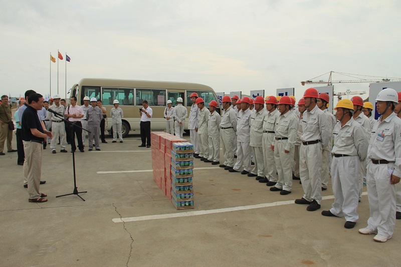 廖汝捷一行察看了沉管預(yù)制施工現(xiàn)場(chǎng),聽(tīng)取了項(xiàng)目管理、文明施工、安全質(zhì)量控制、人文關(guān)懷等情況的介紹,對(duì)奮戰(zhàn)在施工一線的建設(shè)者表示慰問(wèn),送上了工會(huì)對(duì)員工不懼高溫、堅(jiān)持生產(chǎn)的敬意,并為一線工人發(fā)放了600余箱清涼飲料;