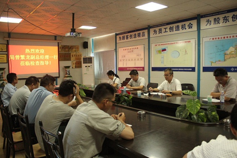 曾繁龍一行聽取了項目部關(guān)于在建工程資金運(yùn)作、已完工項目結(jié)算、催收款工作及在建項目進(jìn)展等情況的匯報,現(xiàn)場察看了寶鋼湛江鋼鐵成品泊位工程5萬噸碼頭及航政樓的施工情況,肯定了項目安全、質(zhì)量和進(jìn)度等工作。