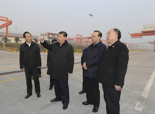 習(xí)近平聽取了長江上游航運(yùn)中心建設(shè)、鐵路公路水路聯(lián)運(yùn)等情況介紹,察看了正在作業(yè)的集裝箱船,聽說渝新歐(重慶—新疆阿拉山口—歐洲)國際鐵路沿線國家實(shí)現(xiàn)一次報(bào)關(guān)查驗(yàn)、全線放行,他贊賞“挺好”。看到港口設(shè)施齊備,已初具規(guī)模,他說:“這里大有希望”。
