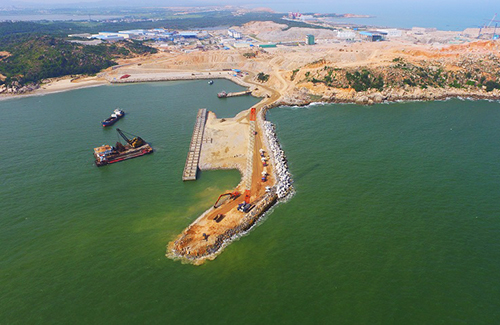 項目施工內容包括1個重件碼頭、438.28米碼頭防波堤、582.5米廠區(qū)西防波堤、港池航道疏浚、導助航標志安裝、重件碼頭與廠區(qū)道路連接段及碼頭附屬設施等。工程共需安裝沉箱31件,其中重件碼頭25件,西防洪堤6件,單件最大沉箱重496噸。項目部創(chuàng)新地使用SPMT工法(自行式模塊運輸車)推進沉箱施工,解決了600t起重船性能限制導致岸側排沉箱無法出運的難題,得到業(yè)主和監(jiān)理的高度評價。