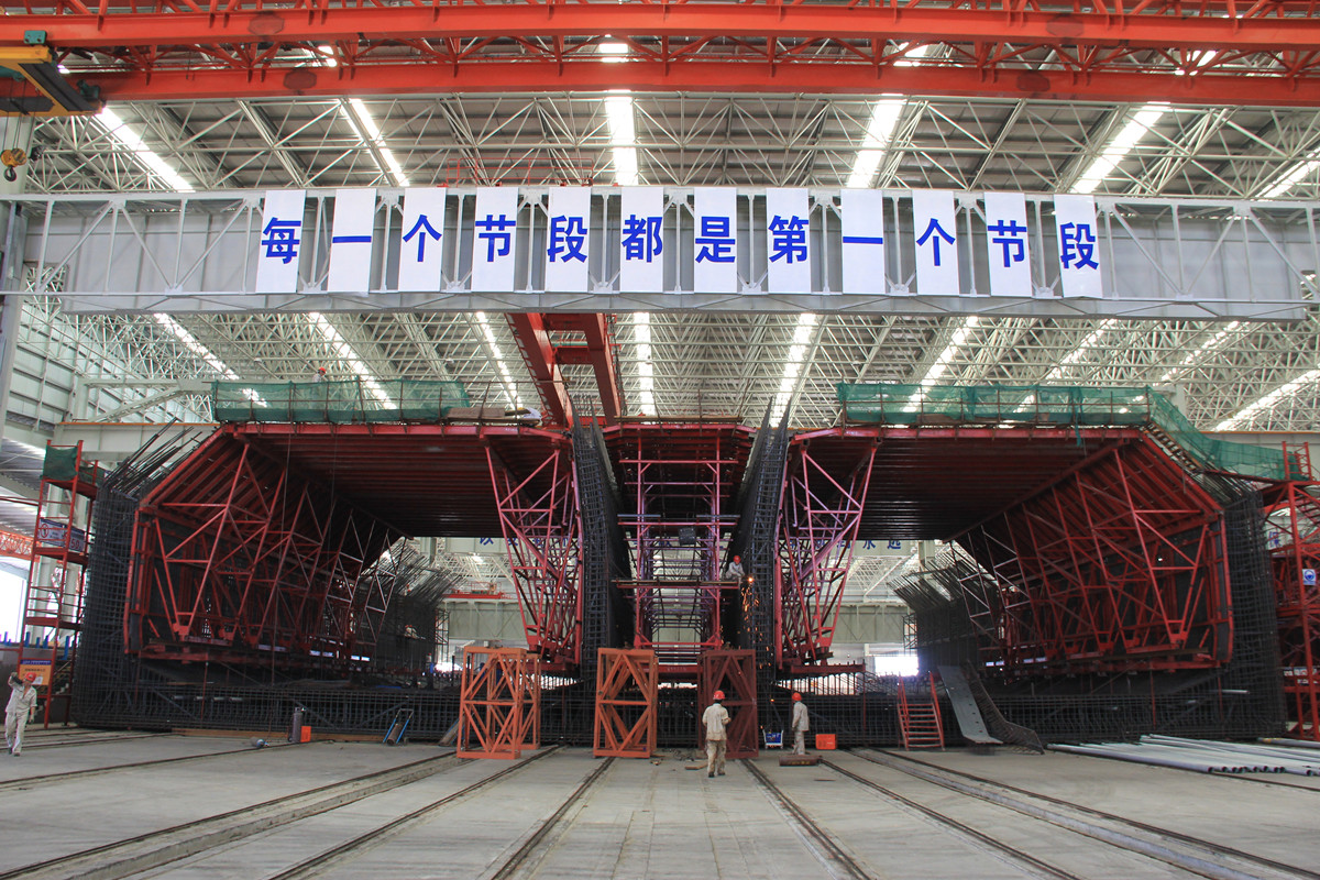 沉管隧道大型管節(jié)工廠法流水線施工屬國內(nèi)首例,該項(xiàng)目在沉管鋼筋流水線施工技術(shù)、全斷面液壓模板系統(tǒng)一次成型沉管施工技術(shù)、大管節(jié)混凝土構(gòu)件防裂技術(shù)、三點(diǎn)支撐液壓頂推技術(shù)等方面均有重大創(chuàng)新,研究成果中多項(xiàng)新材料、新技術(shù)、新工藝、新設(shè)備填補(bǔ)了國內(nèi)技術(shù)空白,成果達(dá)到國際領(lǐng)先水平。