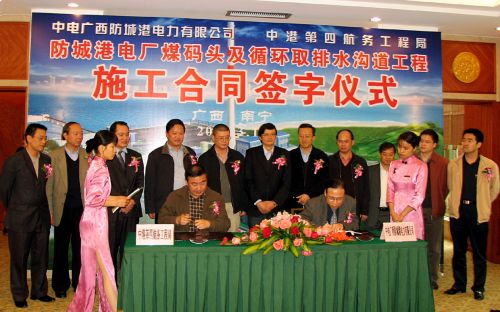 3月16日下午,防城港電廠10萬噸級煤碼頭及循環(huán)取排水溝道工程在南寧舉行施工合同簽字儀式。中電廣西防城港電力有限公司總經(jīng)理呂慕選和局長、黨委書記梁卓仁分別代表業(yè)主方和施工方在施工合同文本上簽字。