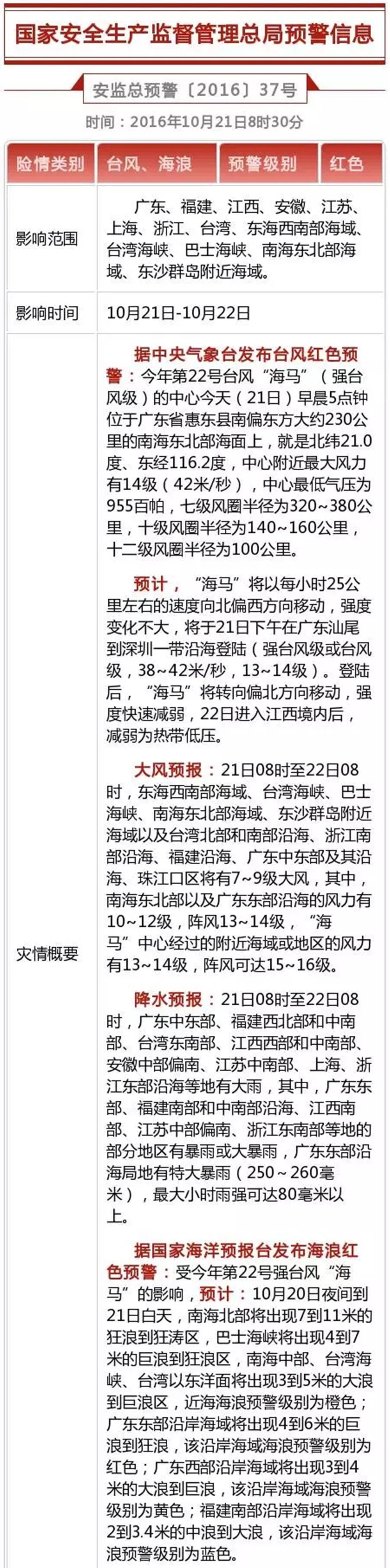 【紅色預(yù)警】"海馬"登陸廣東汕尾,國家安全生產(chǎn)監(jiān)督管理總局發(fā)布紅色預(yù)警,敬請做好防御!