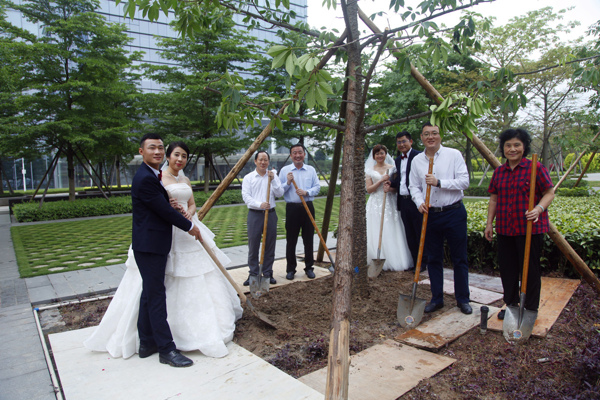 集體婚禮活動期間,梁卓仁、李惠明、楊志超和曹淑珍與新人代表在廣州之窗總部大廈江邊綠化帶參加了植樹活動,以此傳播環(huán)保理念,祈愿新人愛情天長地久。
