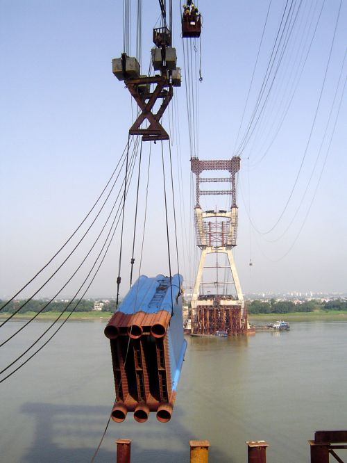 橫跨湘江的四大橋其主跨鋼管拱跨徑為400米,吊裝采用無支架纜索吊裝技術(shù),為確保吊裝安全質(zhì)量、節(jié)約成本,一公司湘潭大橋項目部創(chuàng)新技術(shù)優(yōu)勢,取消了水中主錨錠,改由利用邊拱梁作為纜索的主錨,節(jié)約了近4000立方米混凝土;同時克服了主錨仰角(42度)過大(規(guī)范要求為22~25度)和水上高空安裝等技術(shù)難題,大大提高了吊裝系統(tǒng)的安全系數(shù)。