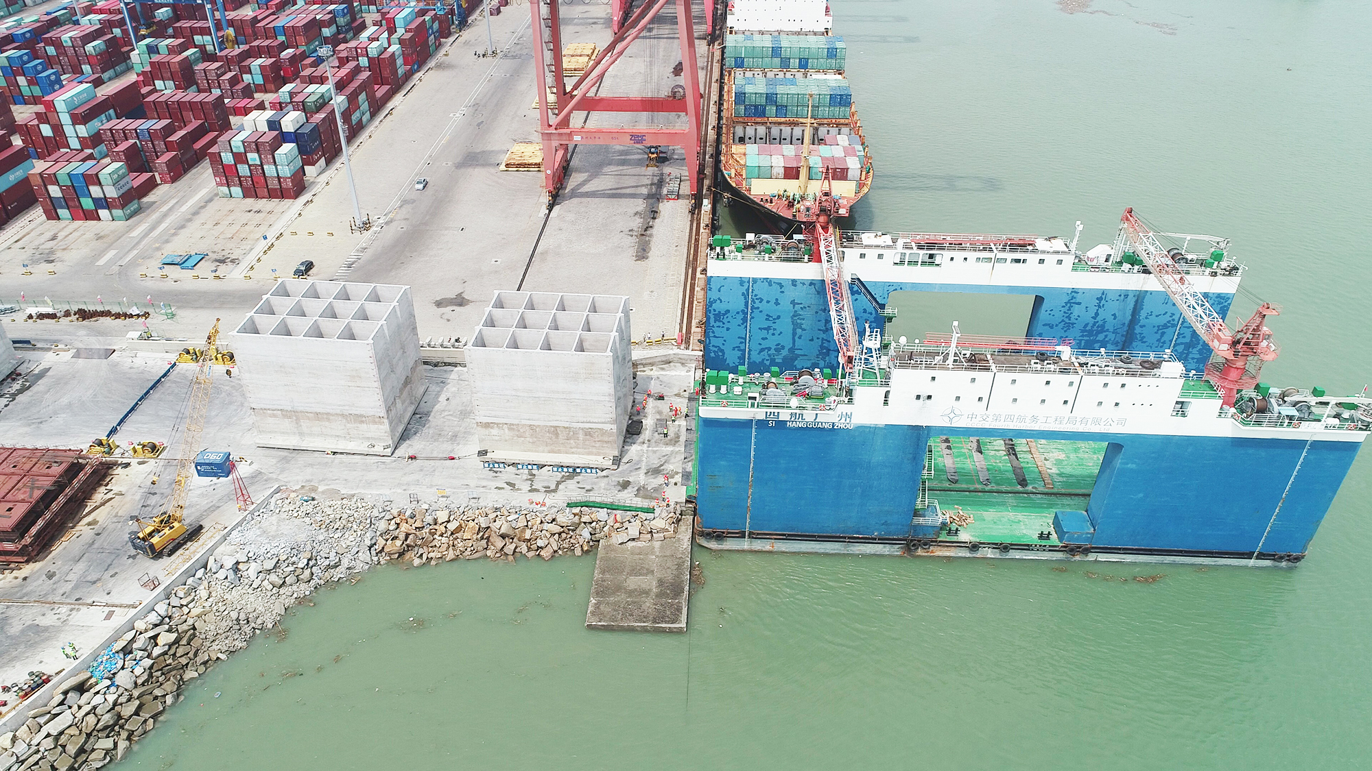 本次出運(yùn)的沉箱采用氣囊出運(yùn)、半潛駁運(yùn)輸就位、起重船定點安裝的工藝,整個安裝過程共歷時48個小時。