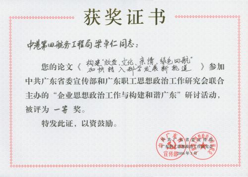 在6月21日召開的廣東職工思想政治工作研究會第十二次年會暨"企業(yè)思想政治工作與構(gòu)建和諧廣東"研討會上,省委宣傳部副部長胡中梅等領(lǐng)導(dǎo)同志向全省90名論文獲獎(jiǎng)?wù)叽眍C發(fā)了獲獎(jiǎng)證書。我局局長、黨委書記梁卓仁同志撰寫的《構(gòu)建"效益、文化、親情、綠色四航",加快轉(zhuǎn)入科學(xué)發(fā)展新軌道》論文,榮獲一等獎(jiǎng)。
