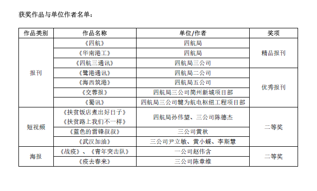 10月14日至15日,全國工程建設(shè)行業(yè)2020年企業(yè)文化大會(huì)和首屆媒體作品大賽在成都舉行,活動(dòng)由中國施工企業(yè)管理協(xié)會(huì)主辦,大會(huì)對(duì)首屆工程建設(shè)行業(yè)傳媒作品大賽優(yōu)秀作品進(jìn)行了表彰。此次大賽共有來自全國工程建設(shè)行業(yè)300余家企業(yè)參加,共計(jì)收到超過600份參賽作品,超過200家單位入圍報(bào)刊評(píng)選。四航局獲得14個(gè)獎(jiǎng)項(xiàng)。其中,《四航》雜志、《華南港工》報(bào)、《四航三通訊》獲得精品報(bào)刊,《四航》雜志以第一名的比賽成績位列榜首,連續(xù)12年獲得全國工程建設(shè)行業(yè)金獎(jiǎng)報(bào)刊。此外,4個(gè)報(bào)刊作品獲評(píng)優(yōu)秀報(bào)刊,4個(gè)短視頻、2個(gè)海報(bào)作品均獲二等獎(jiǎng)。
